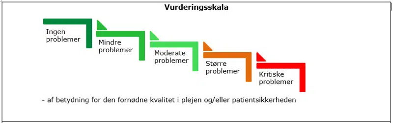Vurderingsskalaen afspejler den samlede vurdering af tilsynet med afsæt i opfyldelse af specifikke målepunkter inden for SEL §§83, 83a, 86 samt inden for sundhedsloven § 138 og 139 om vederlagsfri sygepleje og hjemmesygepleje.